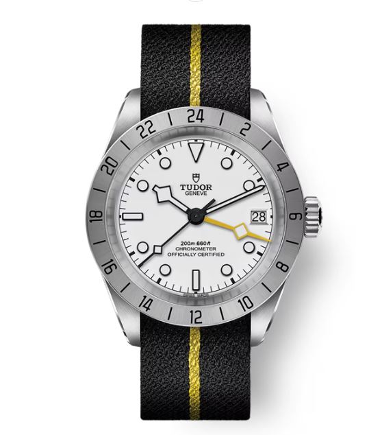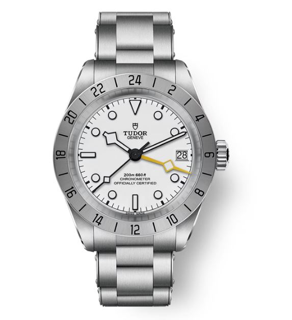 L’ora di riferimento è indicata da una lancetta “Snowflake” gialla dalla forma spigolosa, un elemento estetico distintivo di TUDOR, che compie un giro del quadrante ogni 24 ore. L’ora locale è indicata da un’altra lancetta “Snowflake” più corta che si regola a scatti di un’ora, in un senso o nell’altro. La data, visualizzata tramite un’apertura posizionata a ore 3, è collegata alla lancetta dell’ora locale in modo che, quando si supera la mezzanotte riportando indietro l’ora, (essa) scatti istantaneamente al giorno precedente. Una funzione originale, sofisticata e di grande praticità per l’utente.